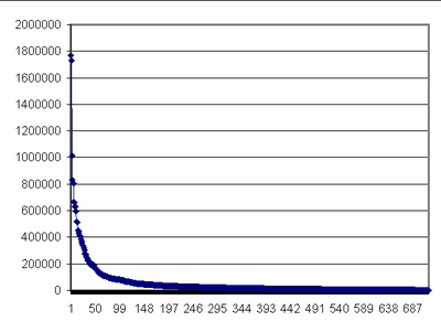 One is the idea of head and tail. One way this might be handled is in terms of a distribution. The distribution of views of the Obama videos in the figure certainly looks like a long tail. The range is from almost 1.8 million for the most viewed video to eleven hundred for the least viewed video. The figure shows that most videos received many fewer than 200,000 views. If you were doing mathematics you might happily divide head and tail by the inflection point, which is the point where the direction of the curve decisively changes. That would be somewhere around 100,000 views. The videos that were viewed more than 100,000 times would be the head and the rest would be the tail. Or you could do the Pareto 80-20 rule; 20% of the videos have 80% of the views. In this case the 20% most viewed videos would be the head and the rest would be the tail. Both of these are ways to define head and tail in terms of the distribution. But Anderson uses a more substantive definition of head and tail.